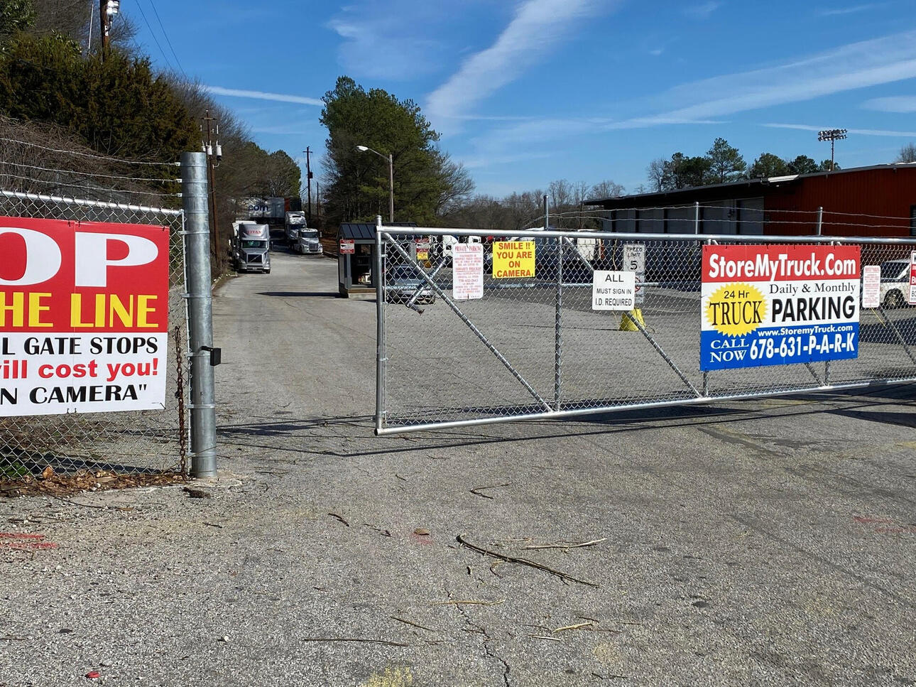 If you need safe daily, monthly or overnight truck and trailer parking in Oklahoma City or College Park, you have come to the right place! Our Oklahoma City Tractor Trailer truck and container parking lot is with security cameras, electronic gated entry, bright overhead lighting and tall fencing. Our Oklahoma City Big Rig Tractor Trailer Truck Stop Parking Lot is established gravel, has huge truck parking spaces, wide aisles and dumpsters onsite for easy trash disposal! Our Oklahoma City big rig truck parking lot is easily accessible from I-285 and I-85 for easy travel to and from your route. Finding a secure place to parking your truck in Oklahoma City has never been so easy! Just look for our StoreMyTruck Signage that is posted right outside the gate. We offer only the best in reserved truck parking in Oklahoma City !